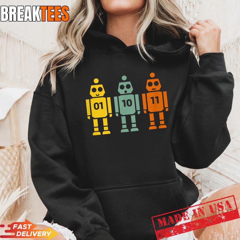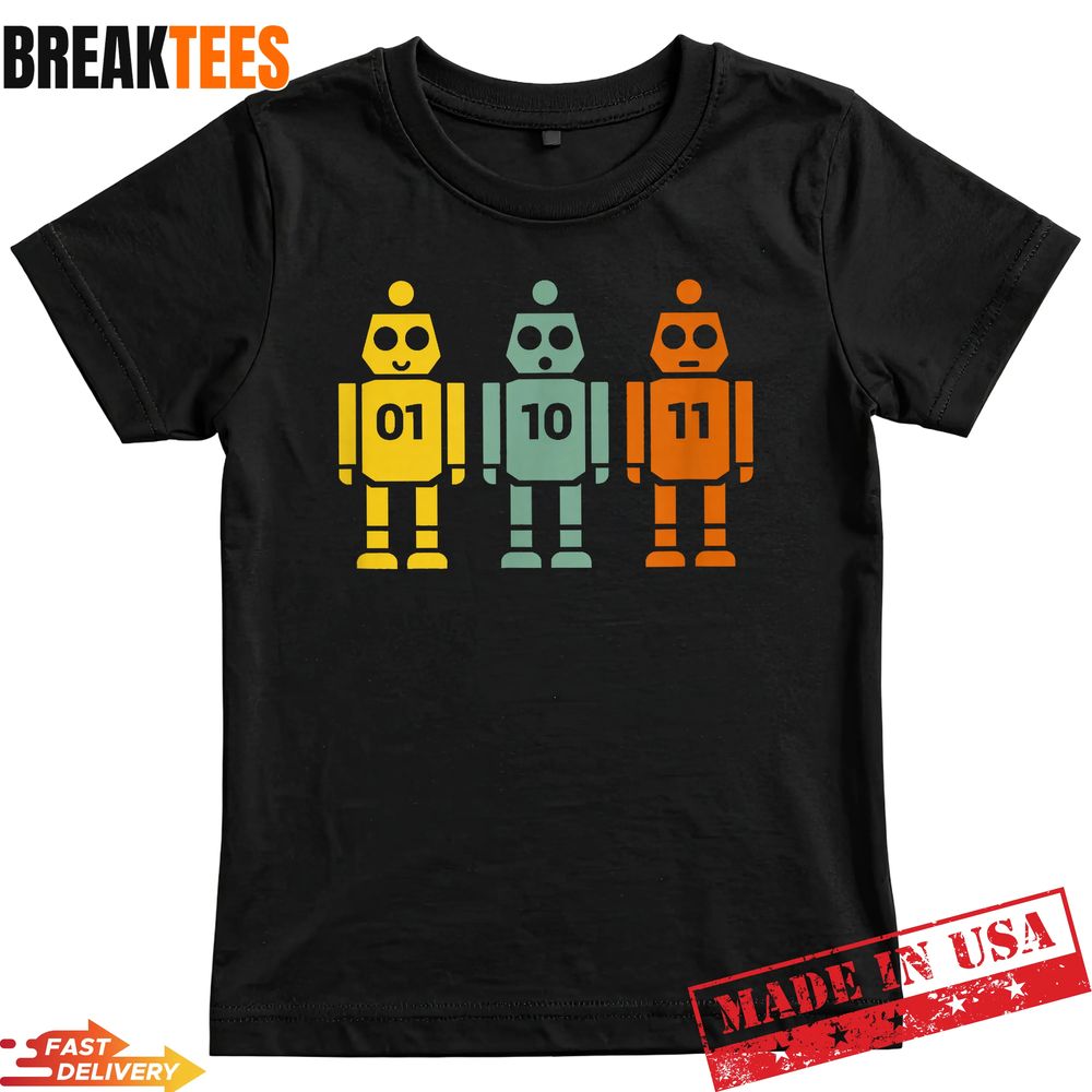 Step into a world of vintage technology and playful aesthetics with our 01 10 11 Robot T-Shirt. This design features three charming, retro-style robots, each numbered with binary sequences that add a clever touch for those who appreciate the roots of computing. Whether you are a software engineer, a retro-gaming enthusiast, or someone who loves clean, minimalist graphics, this shirt is designed to stand out. It combines a nostalgic 70s and 80s color palette with a modern fit, making it a versatile addition to any casual wardrobe. At BreakTees, we pride ourselves on creating apparel that speaks to your unique interests.