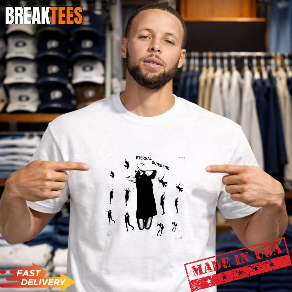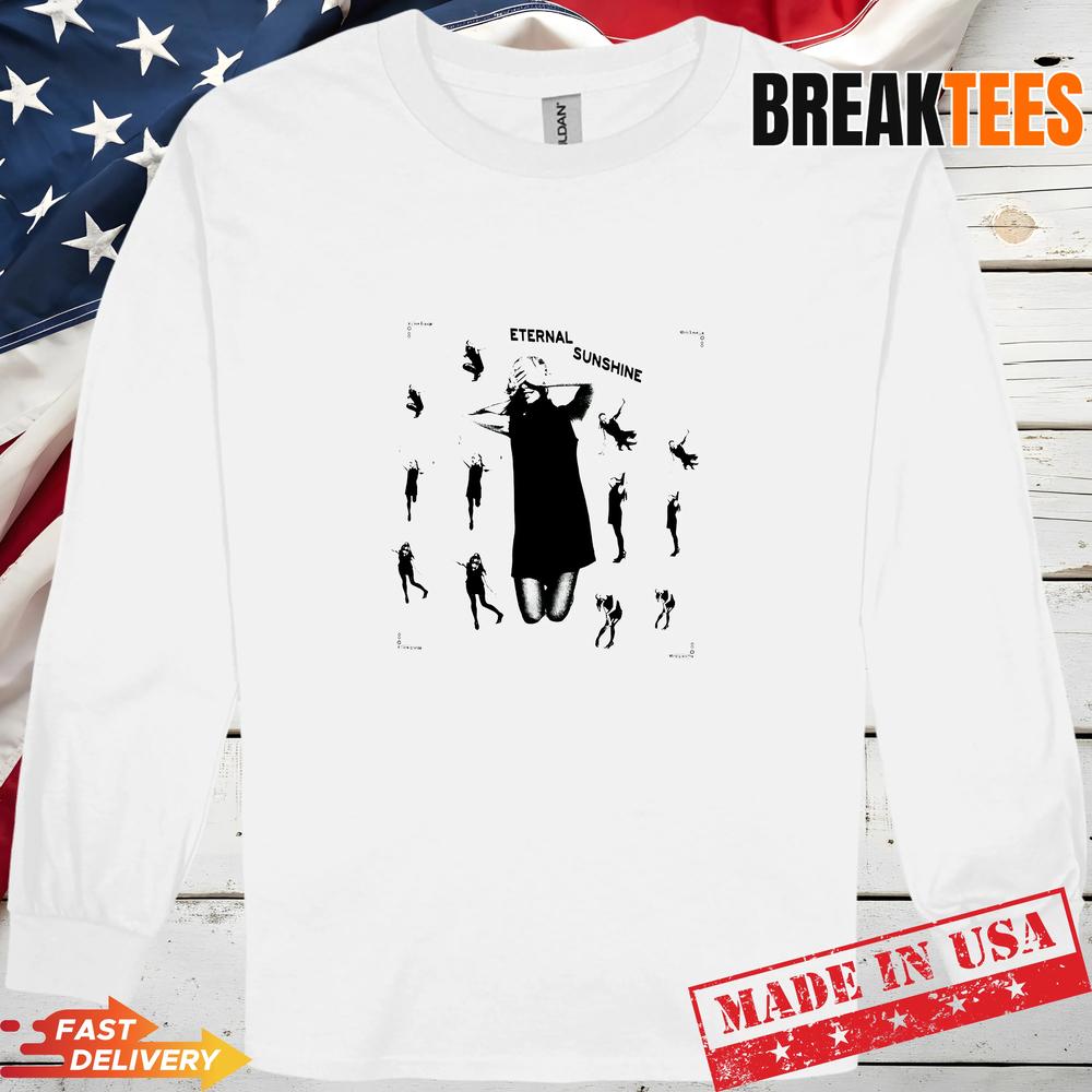 The design is a stunning contrast of black on white, featuring the phrase 'Eternal Sunshine' in a bold, artistic font. The graphics of the hanging figures are super unique and add a cool vibe to the shirt.