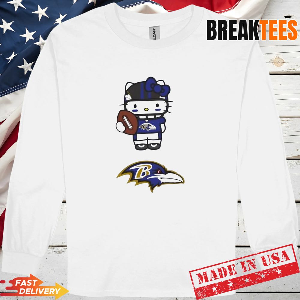 This shirt is designed for true fans—those who appreciate the thrill of football while having a soft spot for cute anime characters. Whether you’re a Ravens devotee, a Hello Kitty collector, or just someone who loves to stand out in a crowd, this piece is for you. It’s not just a shirt; it’s a statement of your passion and personality.