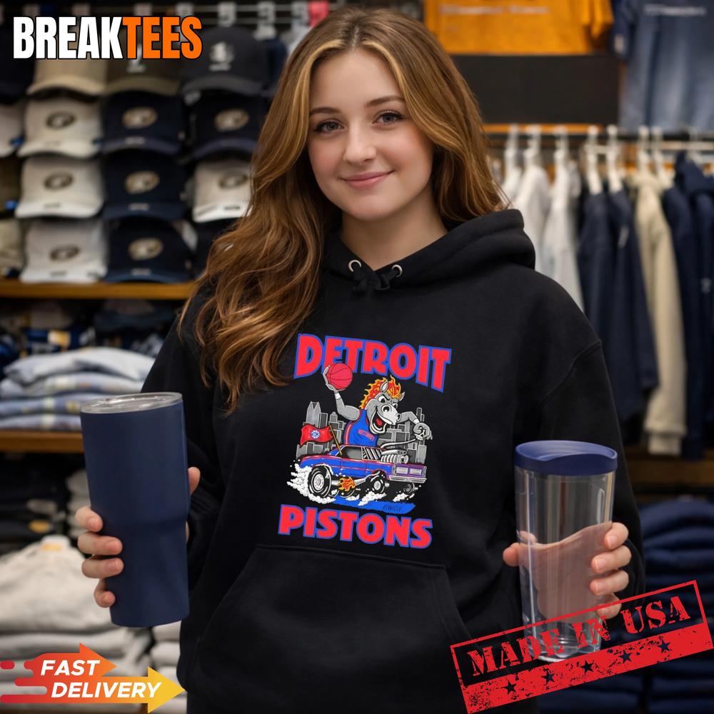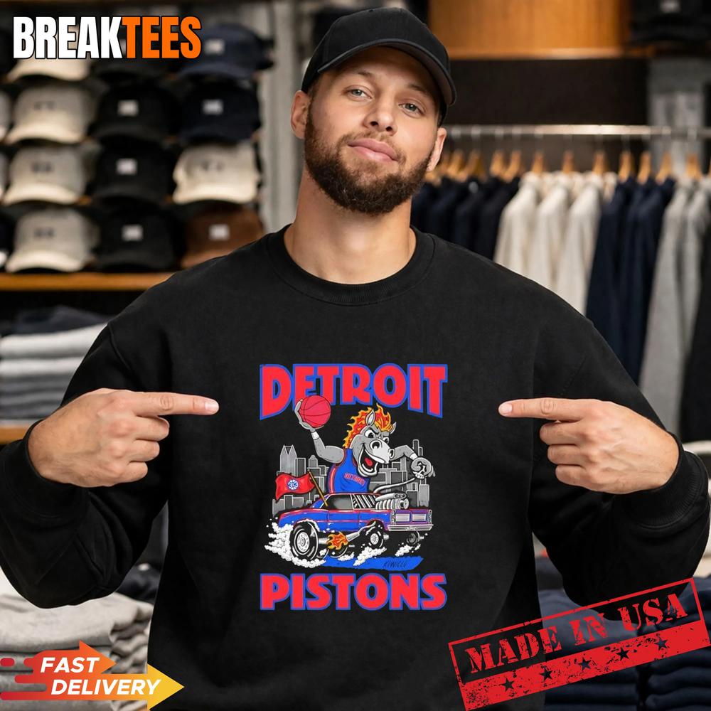 The Detroit Pistons NBA cartoon Hooper Driving Car T-Shirt features a vibrant, eye-catching design that showcases the iconic Pistons mascot, Hooper, behind the wheel of a sleek car. This playful illustration is set against a bold background of the team colors — red, white, and blue — making it a standout piece for any fan. The shirt’s graphics are printed with advanced Direct-to-Garment (DTG) technology, ensuring that the colors remain sharp and vibrant wash after wash. Wear this shirt to show your pride for the team and to celebrate the thrilling moments in Detroit Pistons team history that keep you coming back for more.