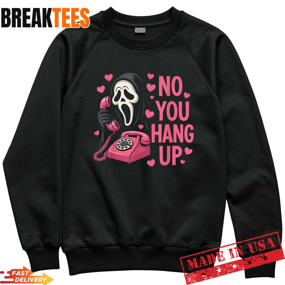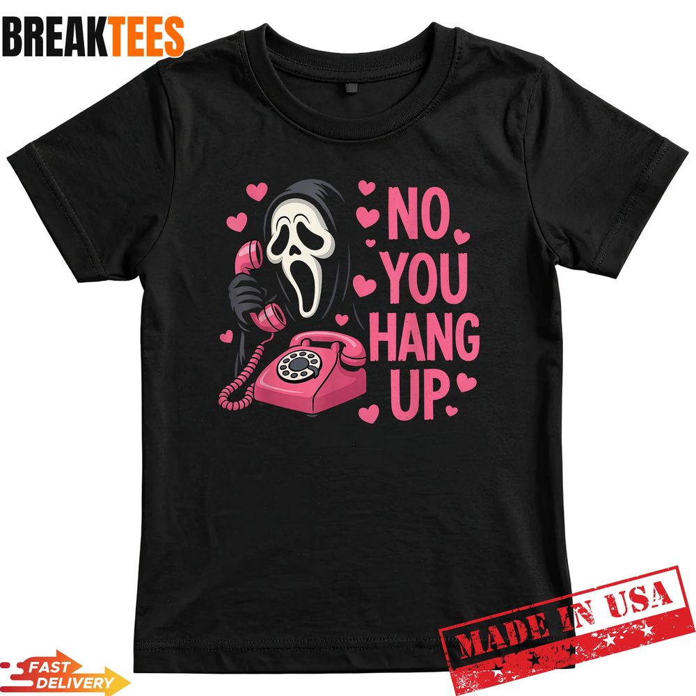 The design features a classic ghost mask character holding a vintage pink rotary phone. Surrounding the figure are charming pink hearts, contrasting the dark hood and mask. The bold typography reads ‘NO, YOU HANG UP,’ creating a humorous narrative that resonates with fans of slasher films and internet culture alike.