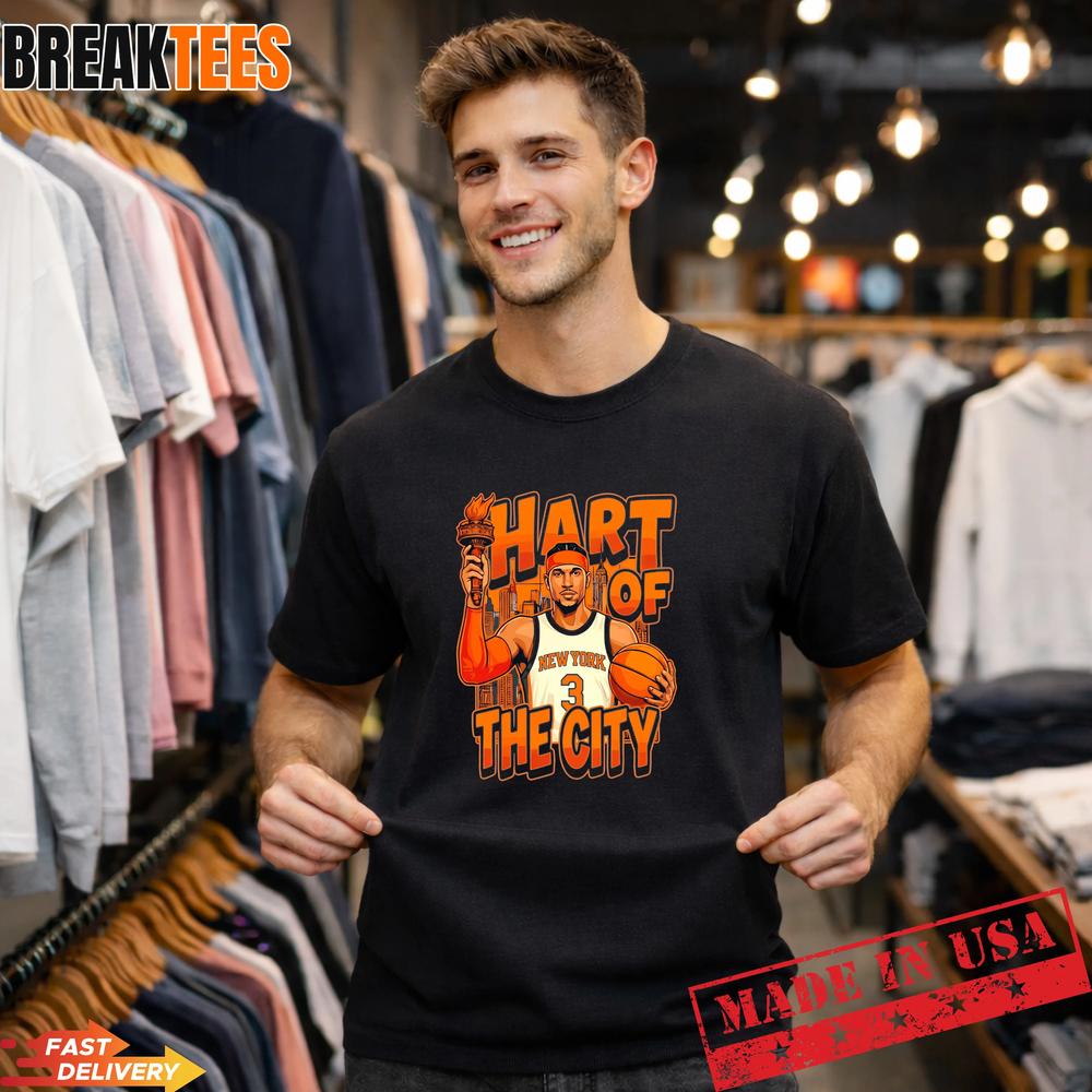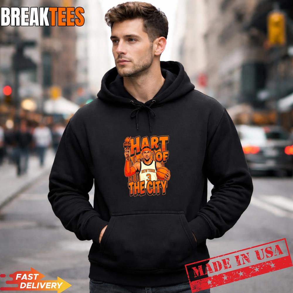 The design of this t-shirt is a tribute to Josh Hart’s impact on the court and his seamless integration into the New York culture. Featuring a bold “Hart of the City” graphic, the artwork incorporates iconic elements of the New York skyline and the classic blue and orange palette. It symbolizes the toughness and dedication that Hart brings to every game, qualities that resonate deeply with the local fanbase. This isn’t just a piece of apparel; it’s a visual narrative of basketball passion, designed to make every fan feel like a part of the team’s legacy.