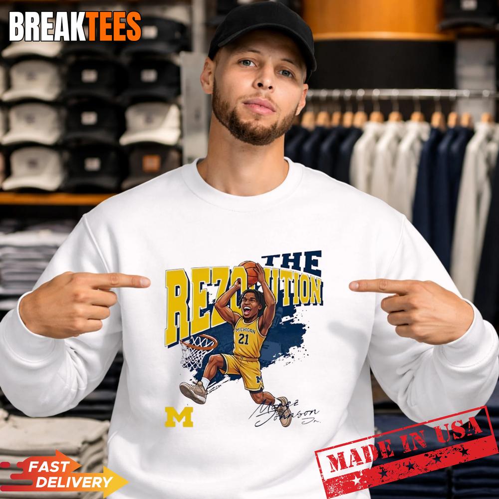 The visual impact of this shirt is undeniable. Centered around a dynamic illustration of Morez Johnson Jr in mid-flight, the artwork uses the iconic Michigan yellow and navy blue to perfection. The typography screams ‘THE REZO-LUTION,’ a creative twist that blends the player’s identity with the unstoppable momentum of the team. Every line and shade is designed to pop, ensuring that your loyalty is visible from the nosebleed seats. This commemorative style apparel honors the hard work and dedication required to compete at the highest level of the NCAA.