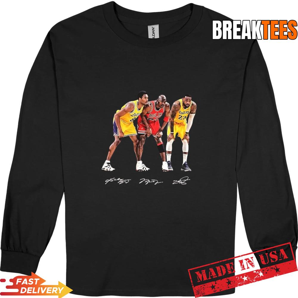 This striking tee showcases a bold color palette that captures the essence of the game. The signatures of Kobe Bryant, Michael Jordan, and LeBron James are emblazoned across the front, with intricate detailing that highlights their unique styles. Whether you’re wearing it to a game or out with friends, this shirt is sure to turn heads and spark conversations about the greatest NBA players comparison and their unforgettable legacies.