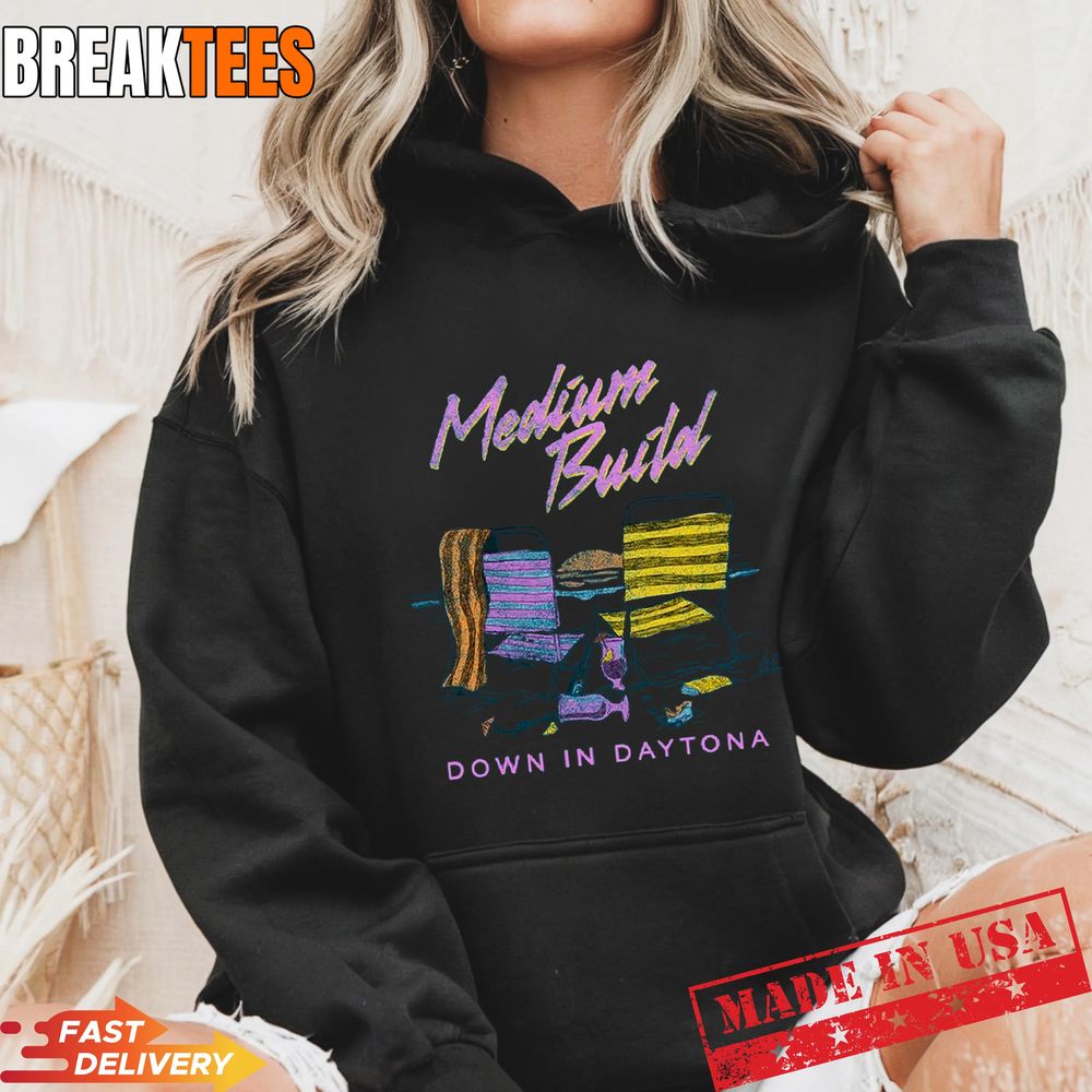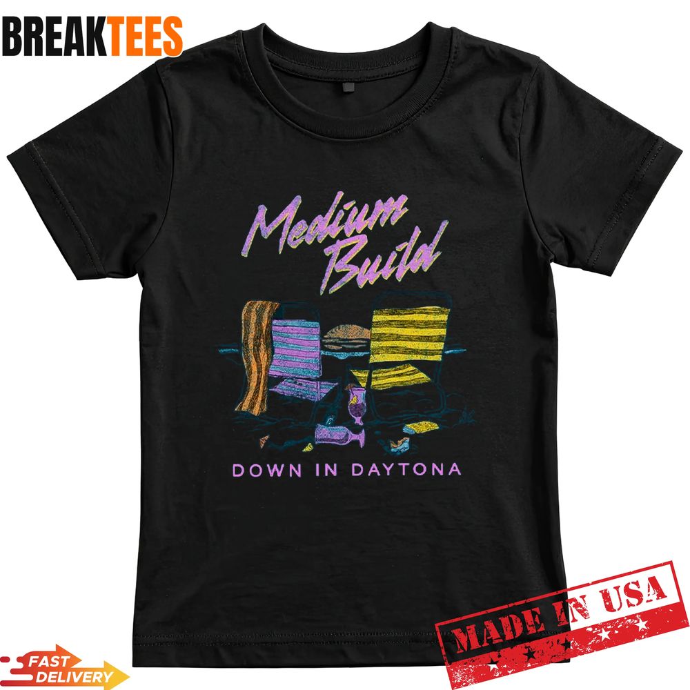 The design of this Spring Break Tee Shirt features a striking graphic that evokes the relaxed atmosphere of a Florida getaway. With vibrant neon accents and a hand-drawn sketch style, the artwork depicts beach chairs and sunset hues that perfectly mirror the artist’s eclectic style. The ‘Medium Build’ typography sits boldly at the top, while ‘Down In Daytona’ grounds the design at the bottom. This visual narrative celebrates the intersection of indie music culture and the timeless tradition of spring break travel. It is a piece of art that speaks to the soul of the modern wanderer.