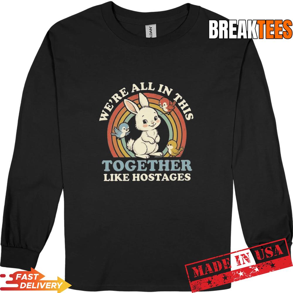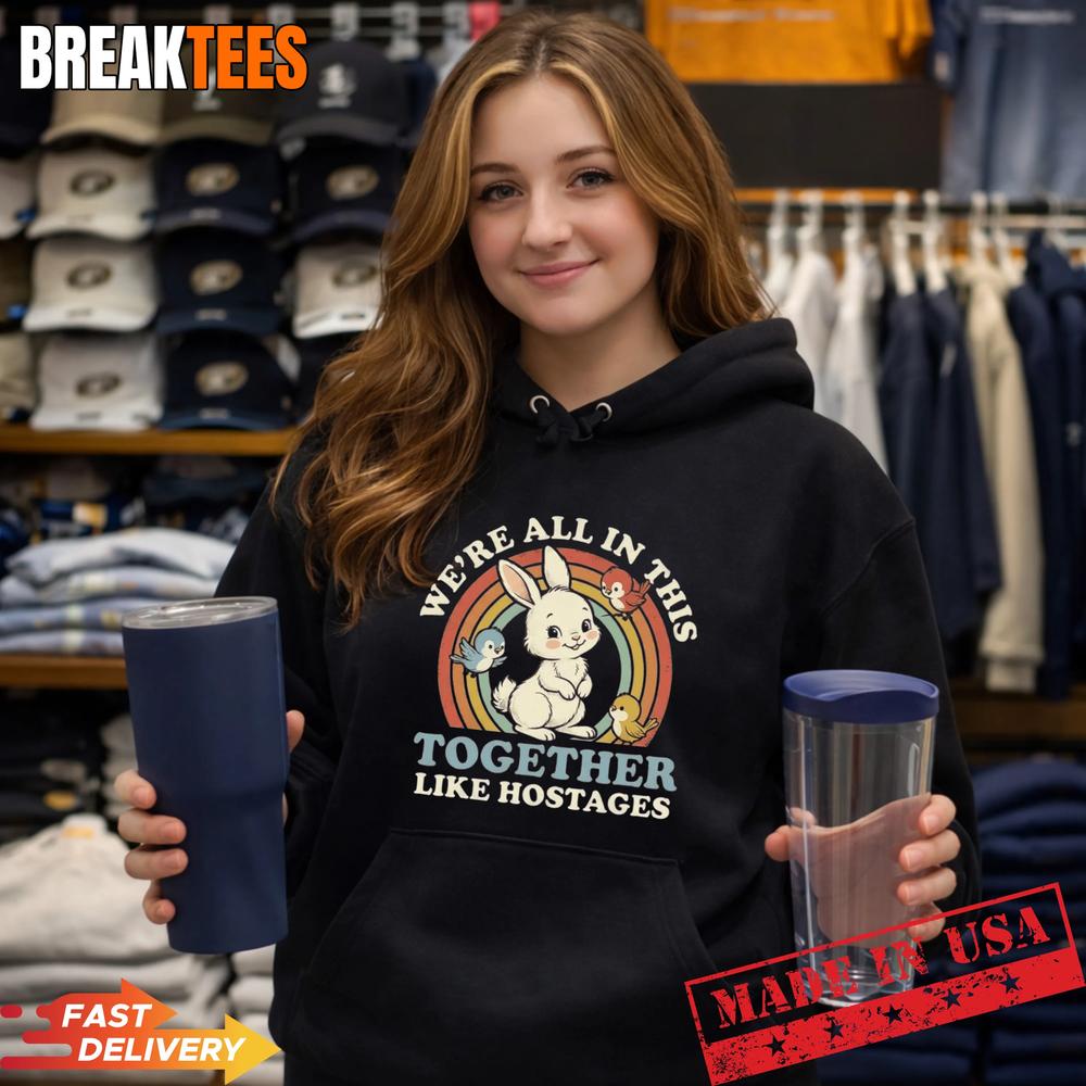 The “We’re All In This Together Like Hostages T-Shirt” features a delightful design that instantly catches the eye. Dominating the front is an adorable cartoon bunny surrounded by a retro-style rainbow arc, flanked by two cheerful birds. The playful font spells out “We’re All In This Together Like Hostages” in a warm, inviting manner. The combination of bright colors and lighthearted imagery makes it a shirt that’s both fun and thought-provoking. It’s a conversation starter that resonates with anyone who’s ever felt like life is a shared experience of ups and downs.